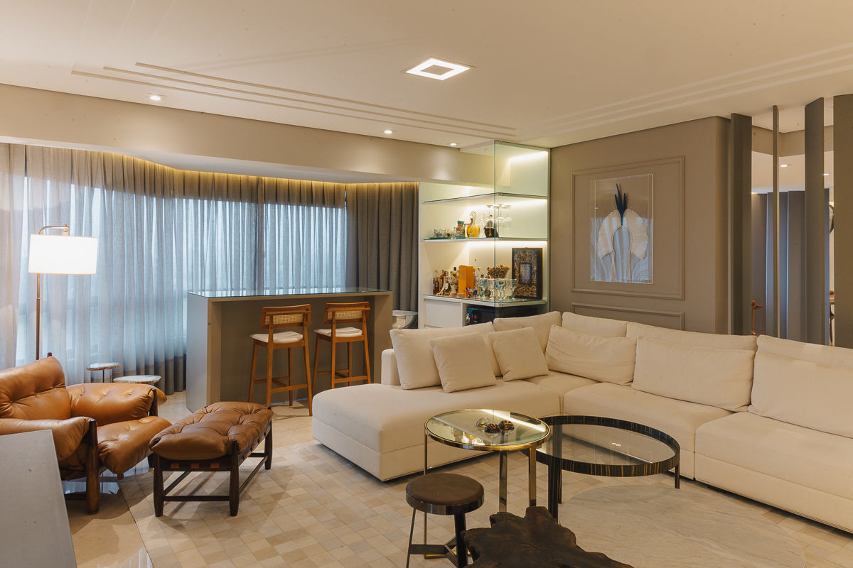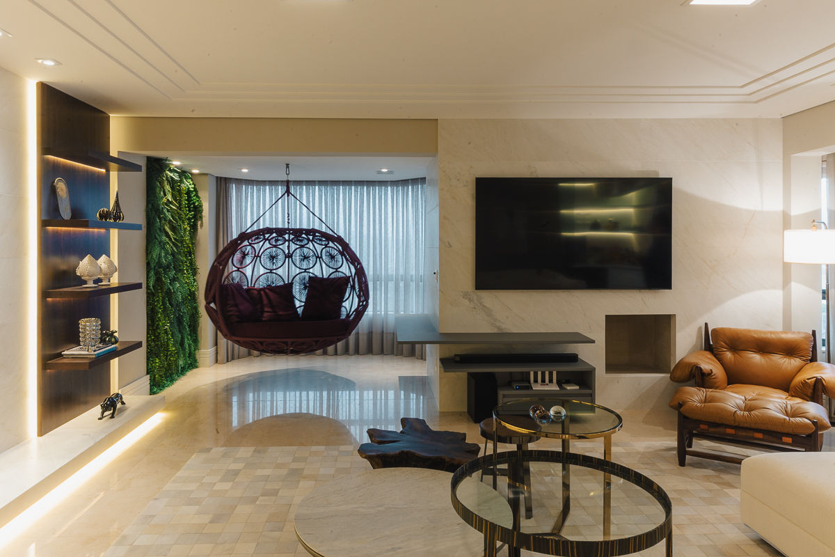 Uma sala de TV em um apartamento aconchegante e sofisticado é construída com materiais nobres como madeira natural e mármore.