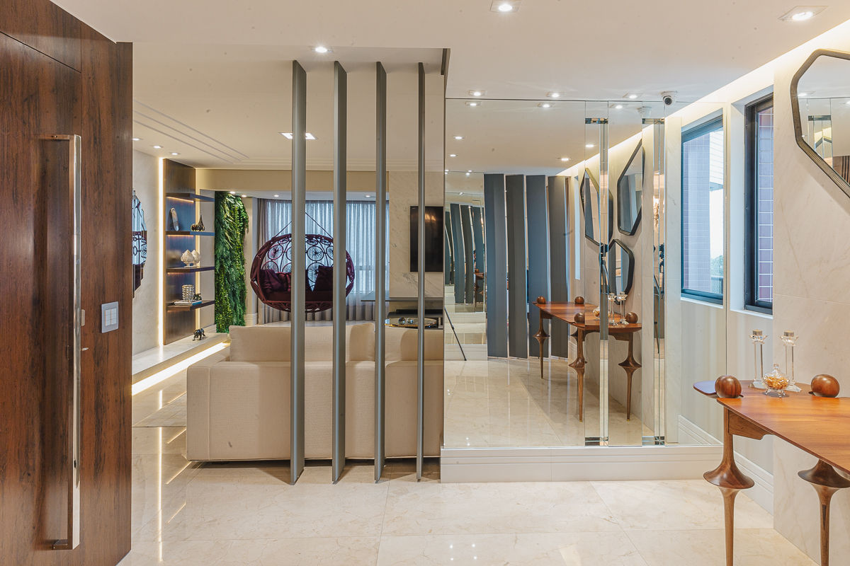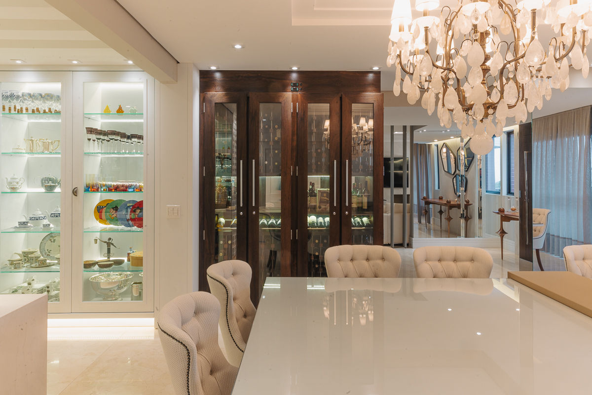 Nosso recente projeto de interiores focou na elegância e harmonia da sala de jantar, com uma paleta de cores claras, cadeiras estofadas para conforto e lustres que criam uma atmosfera acolhedora. Este projeto priorizou a harmonia estética e funcional, resultando em um espaço convidativo e sofisticado, perfeito para refeições e encontros familiares.