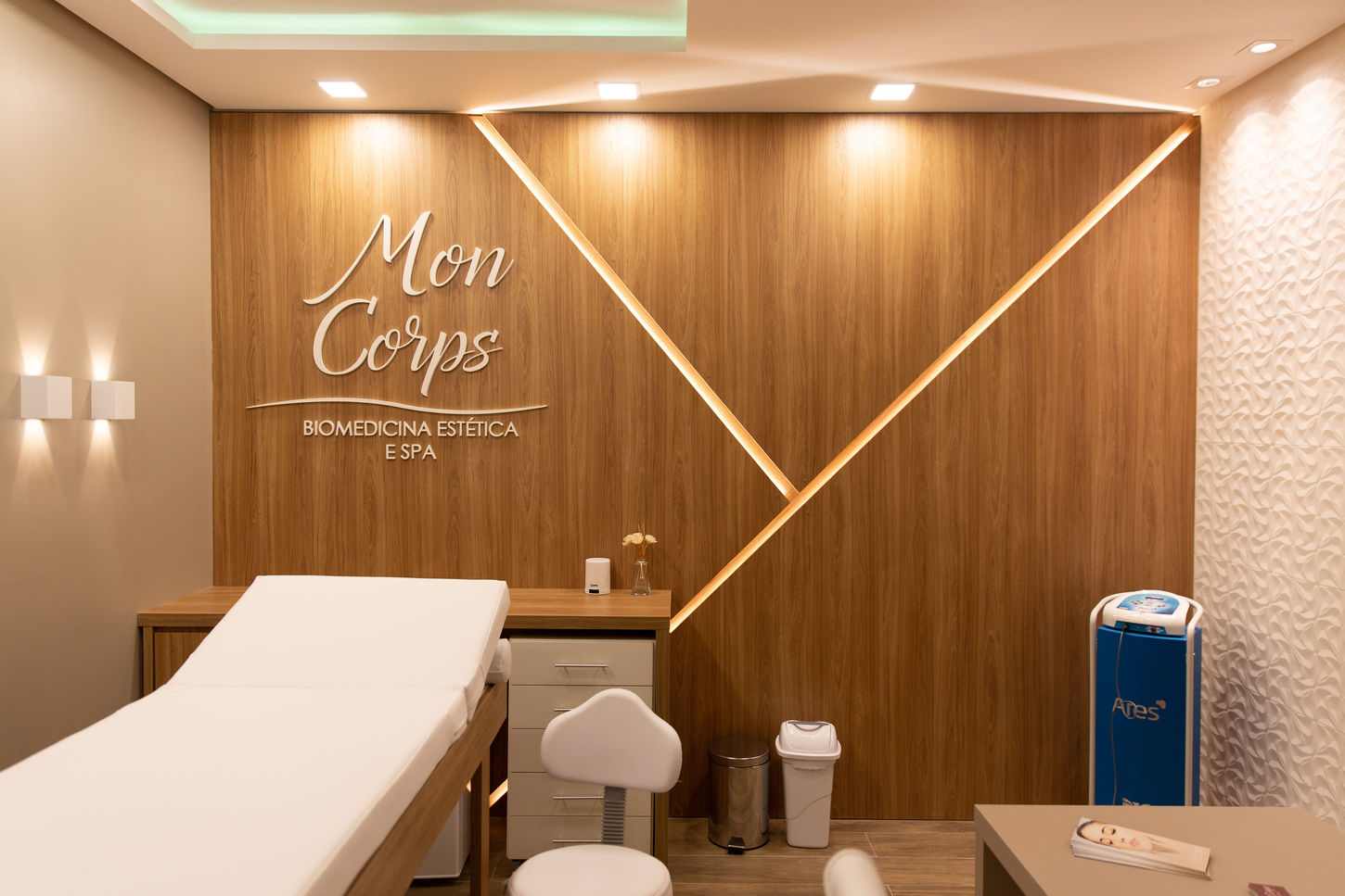 O desafio neste projeto, não era apenas fazer um ambiente elegante, e sim projetar uma clínica estética que interagisse com o spa, cuidando de cada detalhe, passando pelo piso, cromoterapia, texturas, revestimentos e objetos de decoração criando uma atmosfera relaxante, intimista, confortável e convidativa, para os momentos de relaxamento e cuidados estéticos dos clientes.