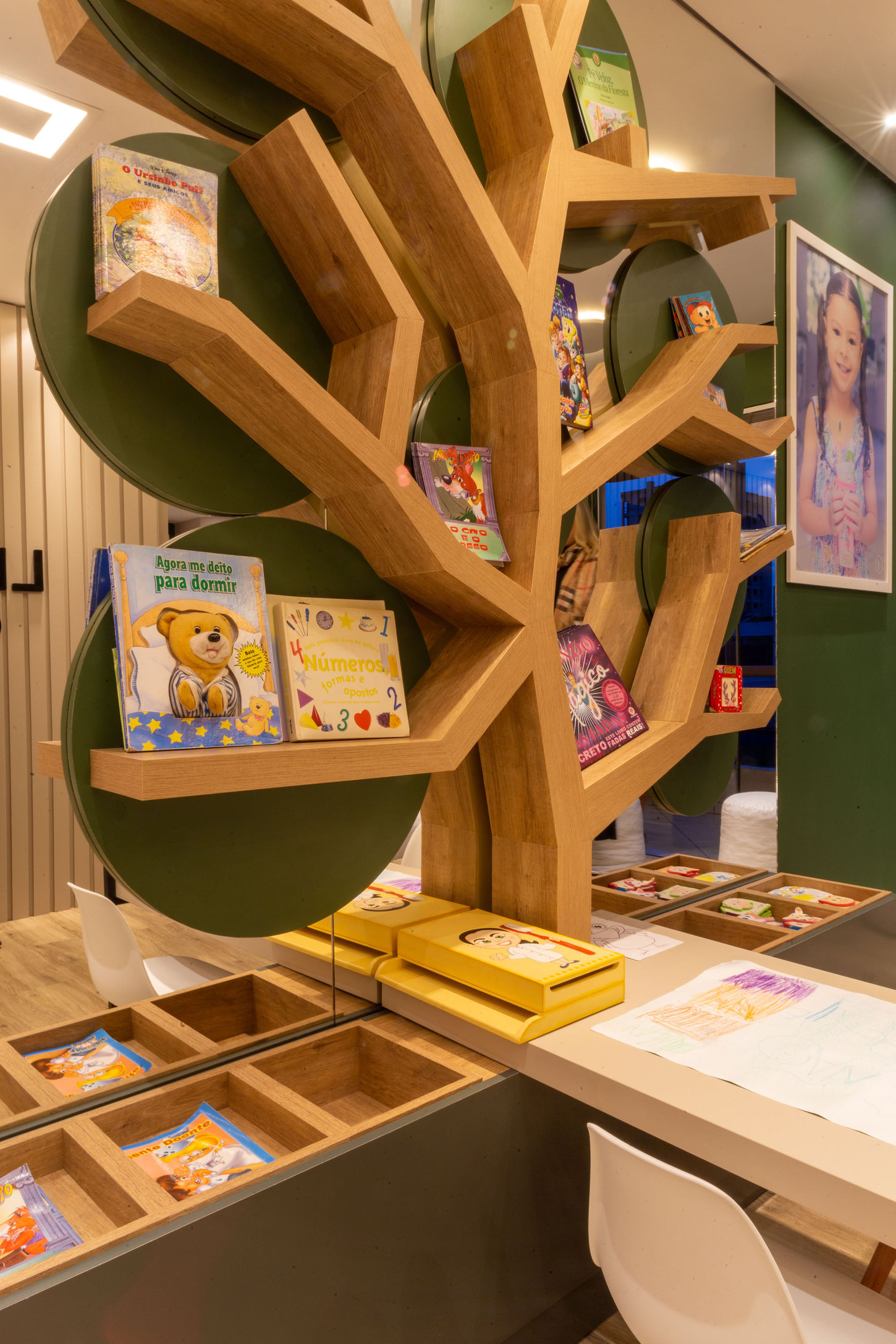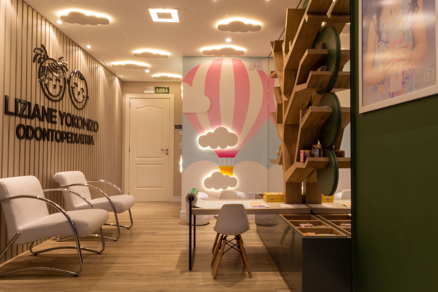 Muitas pessoas quando projetam um consultório ou ambiente no qual o público são crianças, pensa de forma diferente criando um espaço voltado para os adultos. Porém deve ser observado o público alvo de cada cliente e atender o mesmo de forma primária. Neste consultório criamos um espaço intuitivo e trazemos elementos lúdicos que deixem ele mais rico para os pequenos porém mantendo elegância e requinte ao ambiente. No projeto final temos uma parede com nuvens e balões para os pequenos entrarem em um universo bonito e animado durante a espera, além da mesa de papel para desenho aonde os pequenos passam o tempo de ansiedade e espera desenhando.