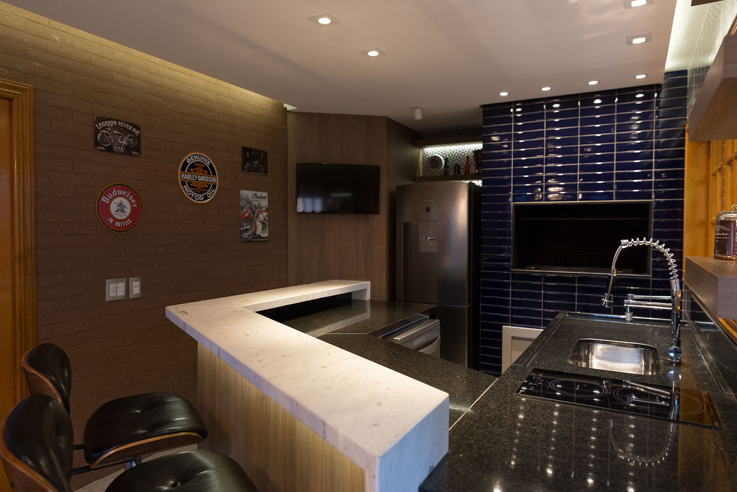 Final de semana sempre pede um churrasco com a família e os amigos não é mesmo? Neste projeto desenvolvemos uma churrasqueira que aproveitasse melhor o espaço proposto e também trabalhamos uma paleta de cores masculina, desde o revestimento Blue Liverpool até as banquetas em tons mais escuros e modernos com aplicações em madeira. Por ser um espaço de encontros e momentos agradáveis da casa, a churrasqueira pede um planejamento especial para que o ambiente atenda todos os requisitos de quem usa a área de preparação da carne até os convidados que ficam no ambiente.