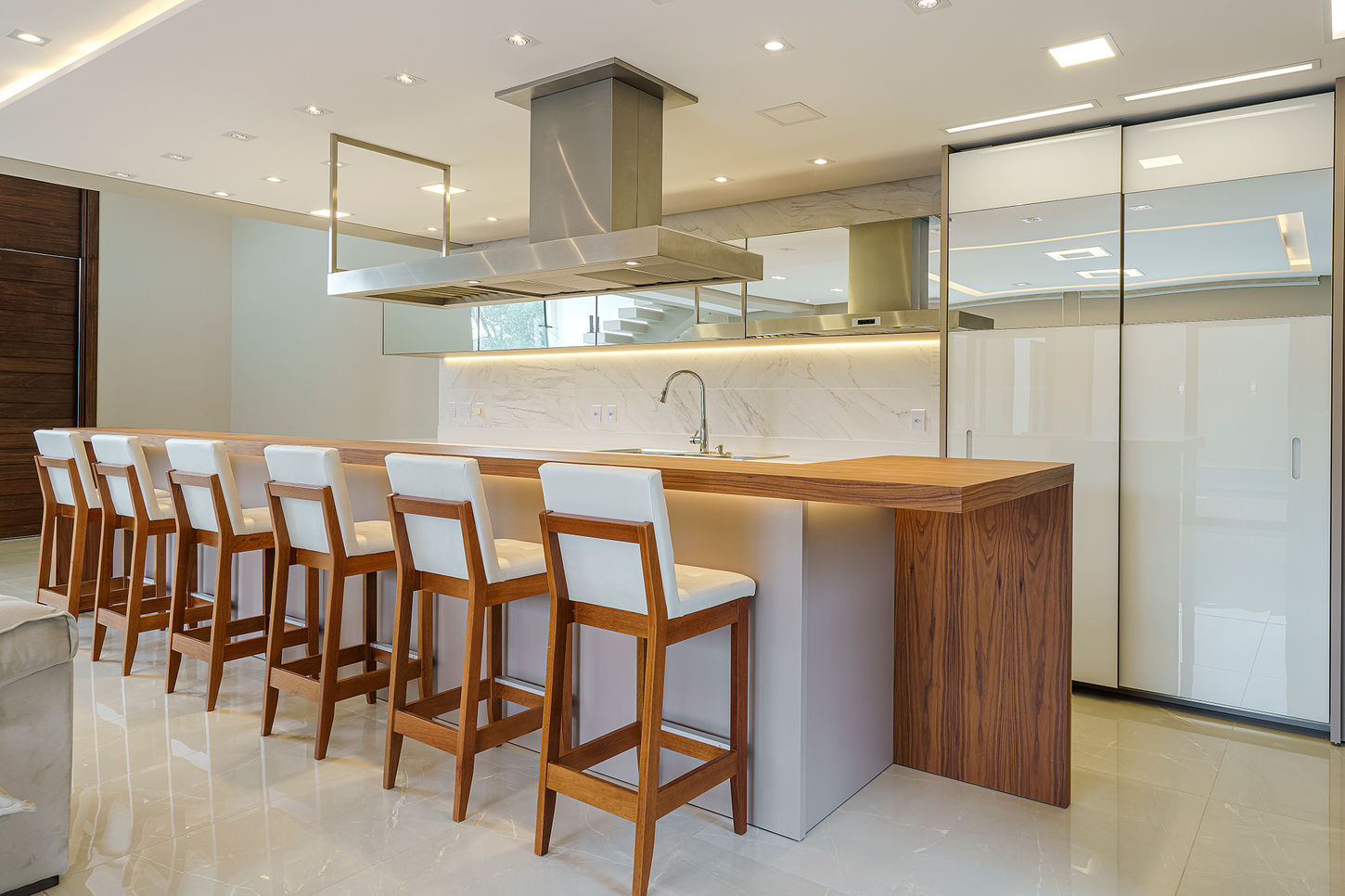 O ambiente integrado hoje se tornou um grande aliado nos projetos arquitetônicos pois sua versatilidade e espaço amplo permitem o ambiente ficar moderno, aconchegante e o tempo de vivência se torna maior no ambiente. Neste projeto, trabalhamos a sala de TV e a Cozinha Gourmet integrados, permitindo assim uma união familiar por mais tempo e também um maior proveito do espaço. Bancada ampla com banquetas confortáveis para a recepção de amigos junta com a sala de TV para acomodar os demais convidados que visitam a residência permitindo uma interação maior durante a cocção, deixando assim o clima descontraído e confortável para todos. Versatilidade, espaço amplo e modernidade unidos em um projeto.