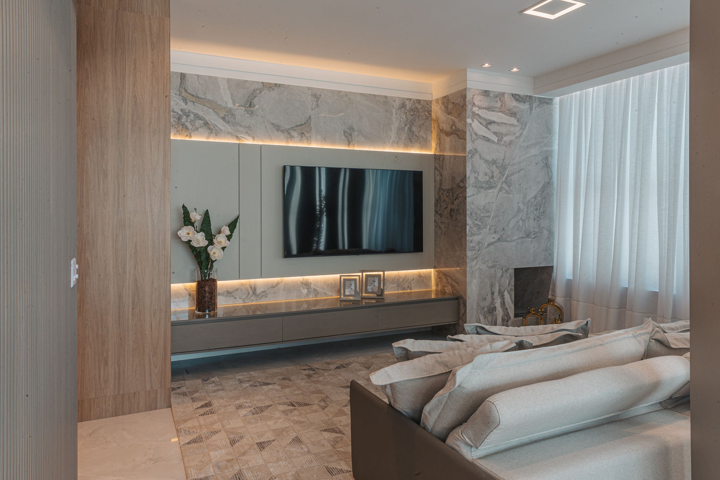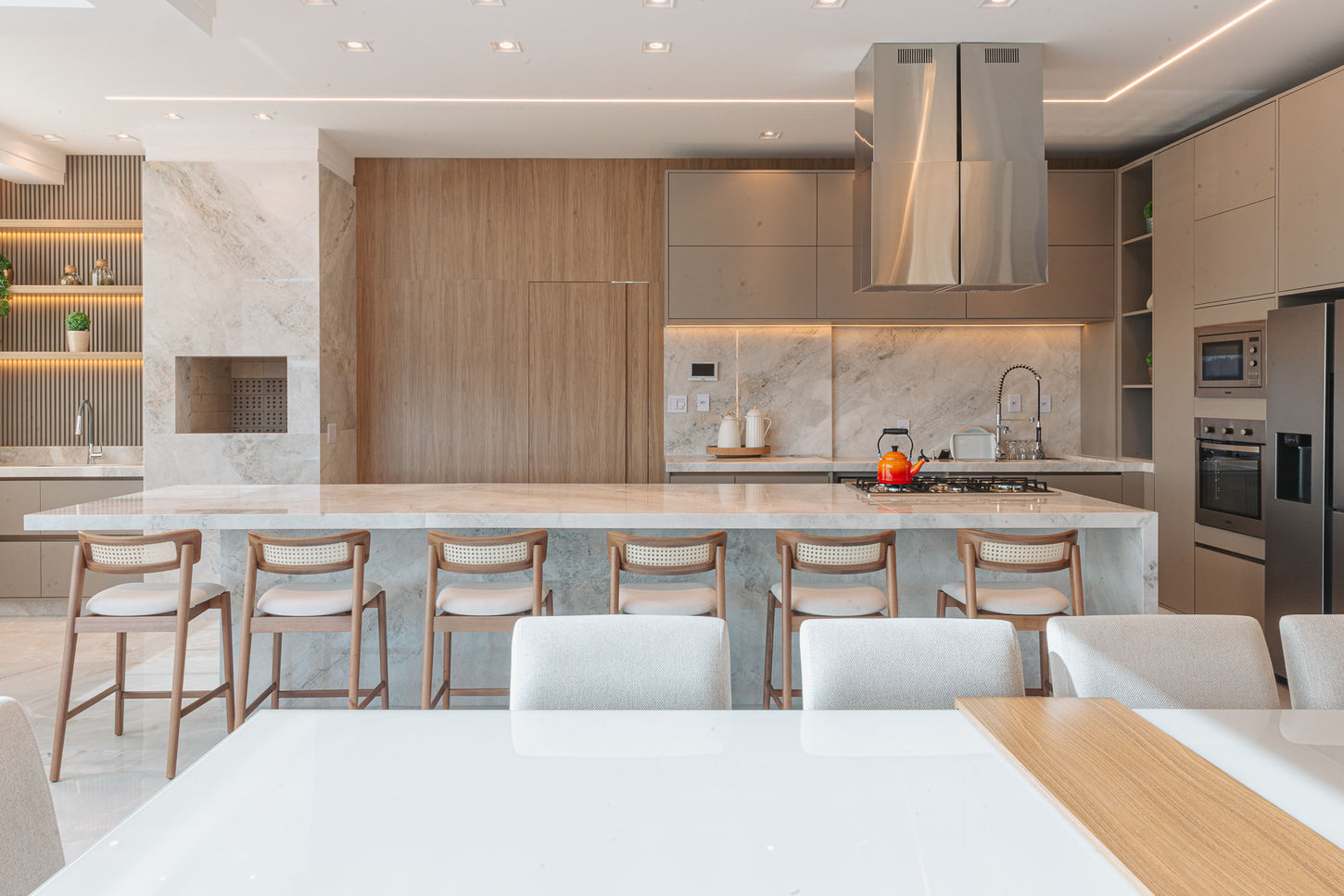 Neste espaço integrado, encontramos uma perfeita combinação de sofisticação e contemporaneidade, onde tons suaves criam uma atmosfera acolhedora.